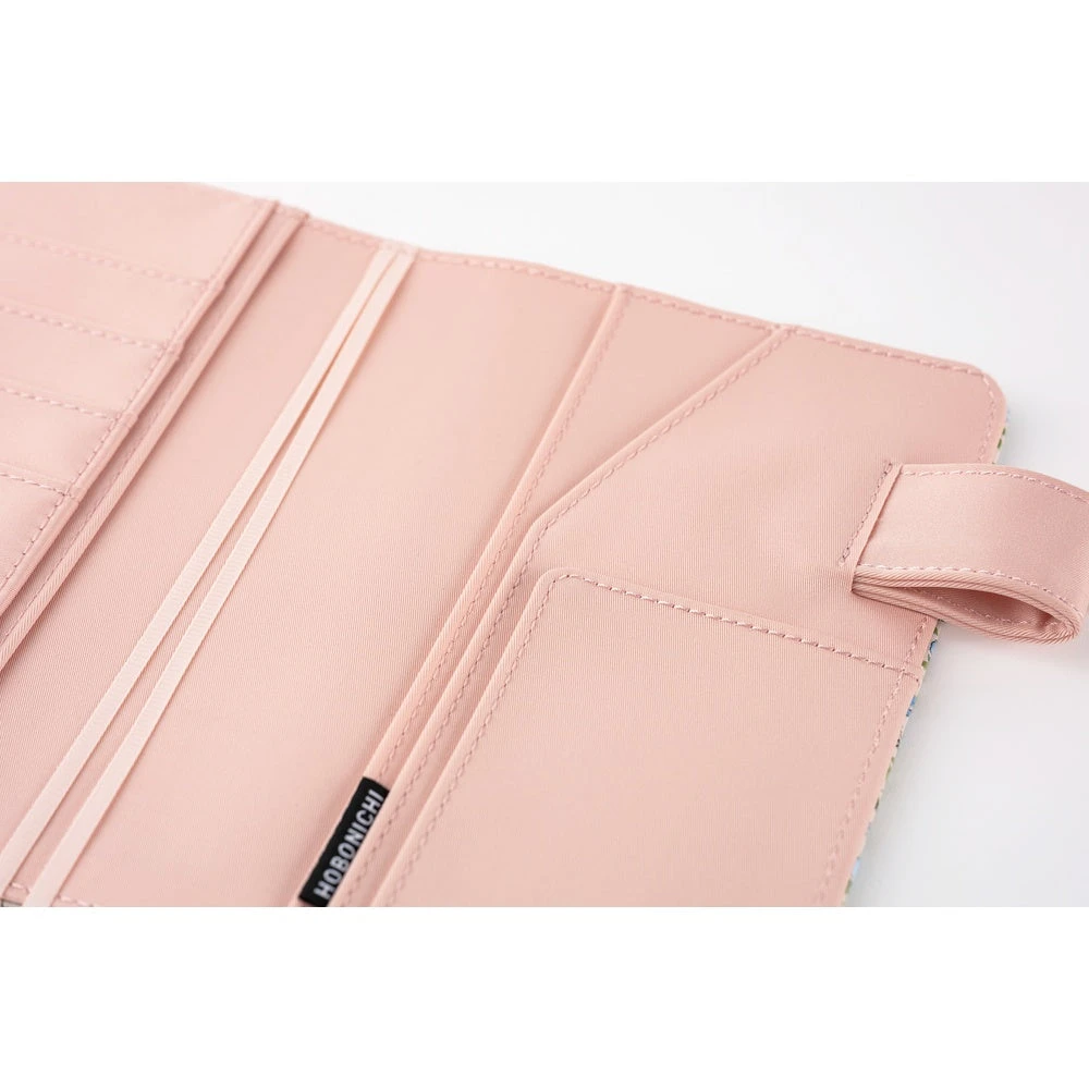 A delicate floral pattern reminiscent of the pastoral illustrations by picture book author Kate Greenaway. Pink and light blue anemones flutter softly, surrounded by tiny buds and leaves that evoke a meadow swaying in the breeze. The interior is a pale pink, balancing cuteness with sophistication. It has “butterfly stopper” pen holders that also function as a clasp to keep the cover shut.