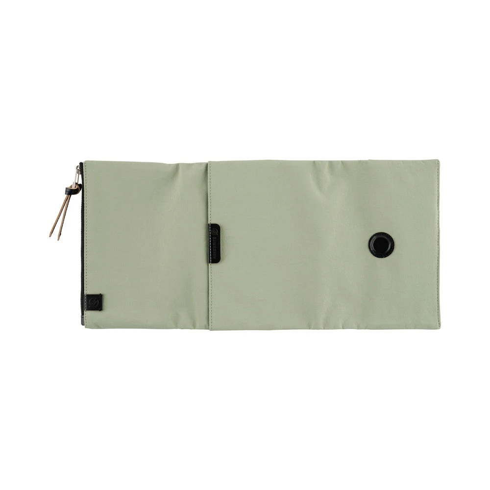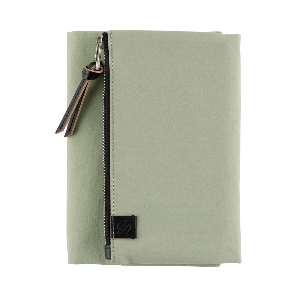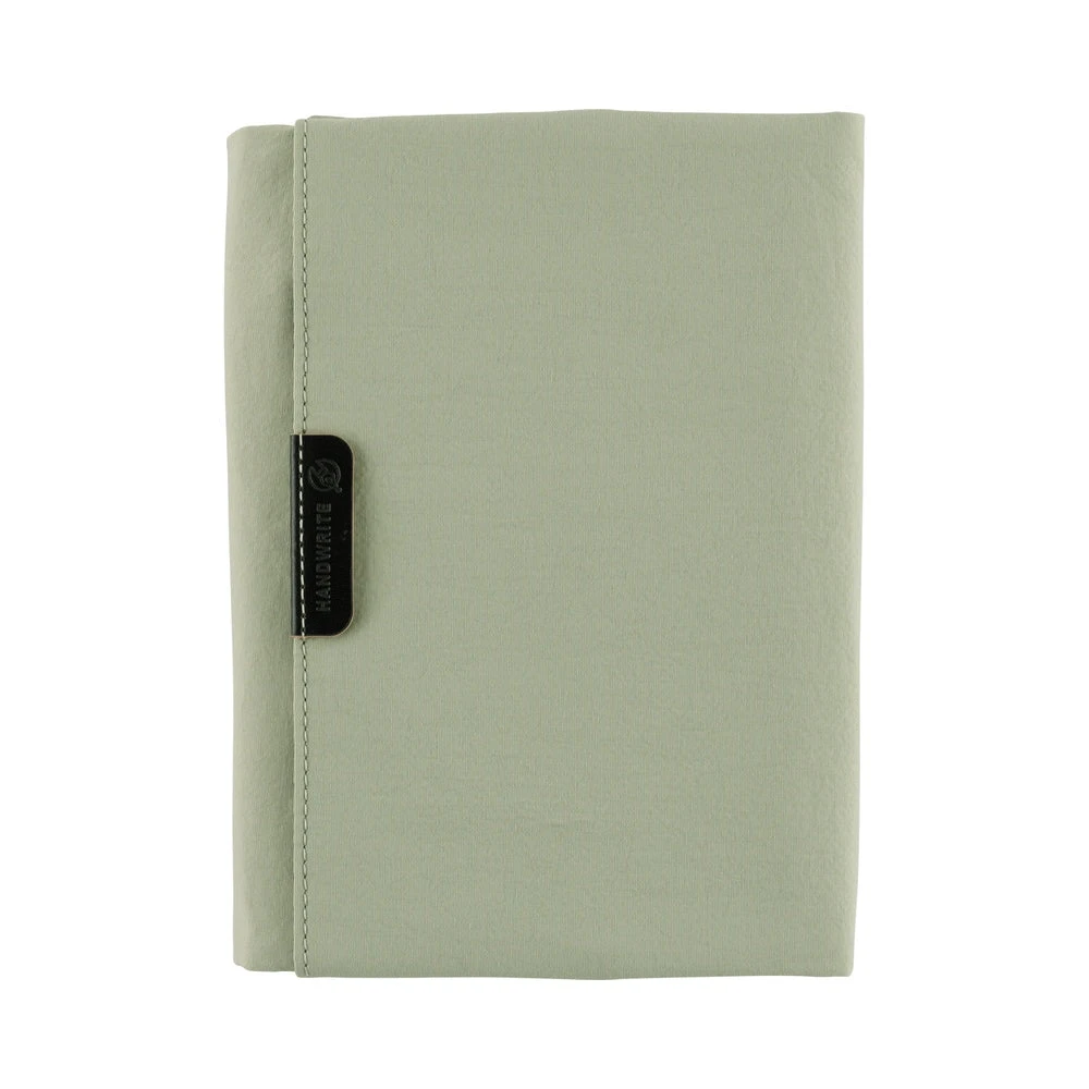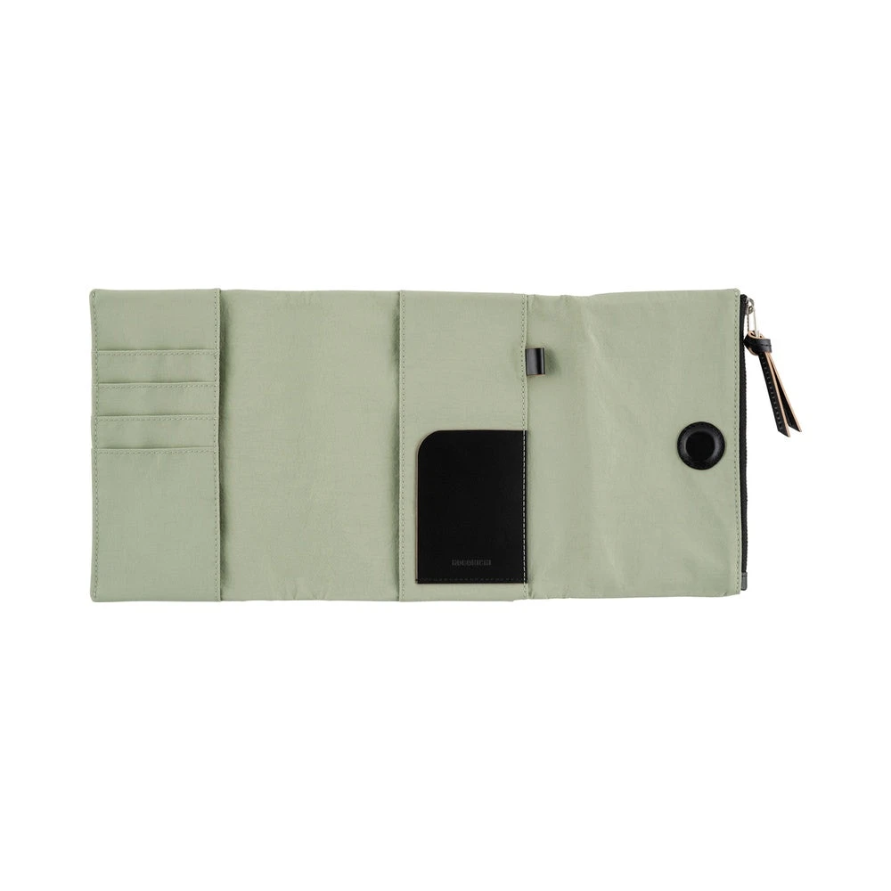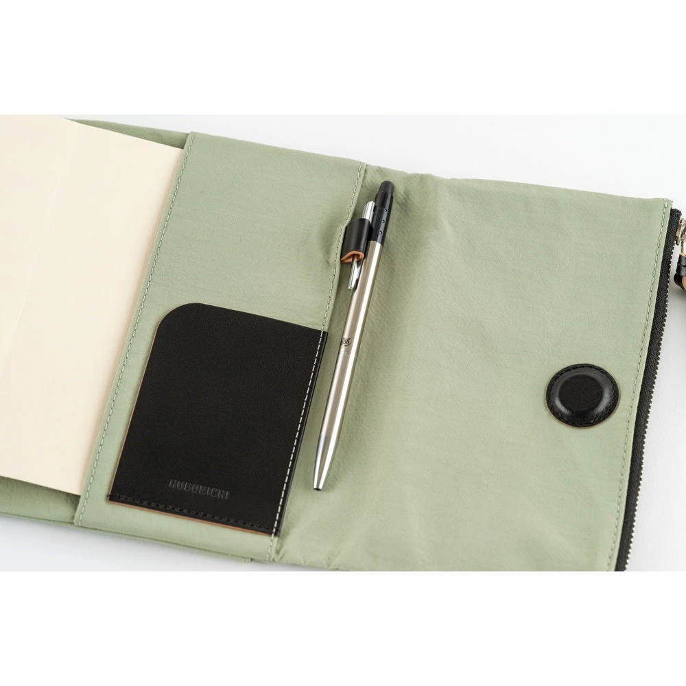 A cover with a zippered pocket that can hold plenty of pens and stationery. Made from nylon, the color is a soft, soothing shade of oakmoss, designed to suit anyone. This tri-fold cover stays shut with a button and includes an interior pen hook for storing a pen by its clip.
