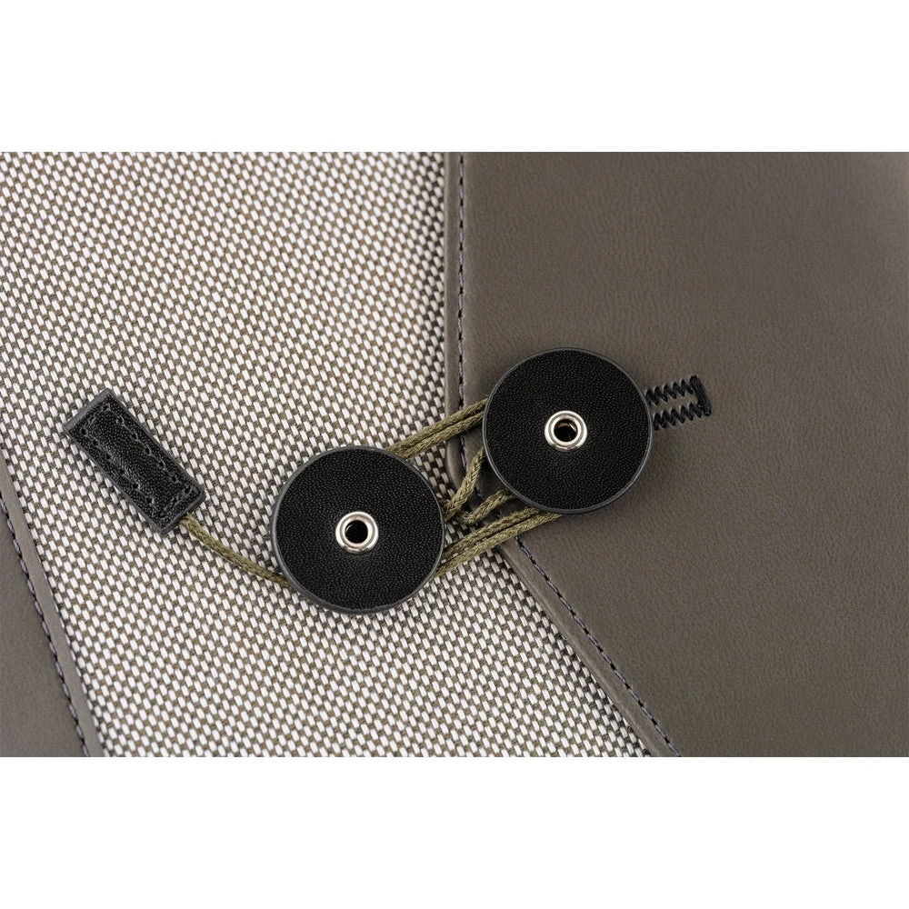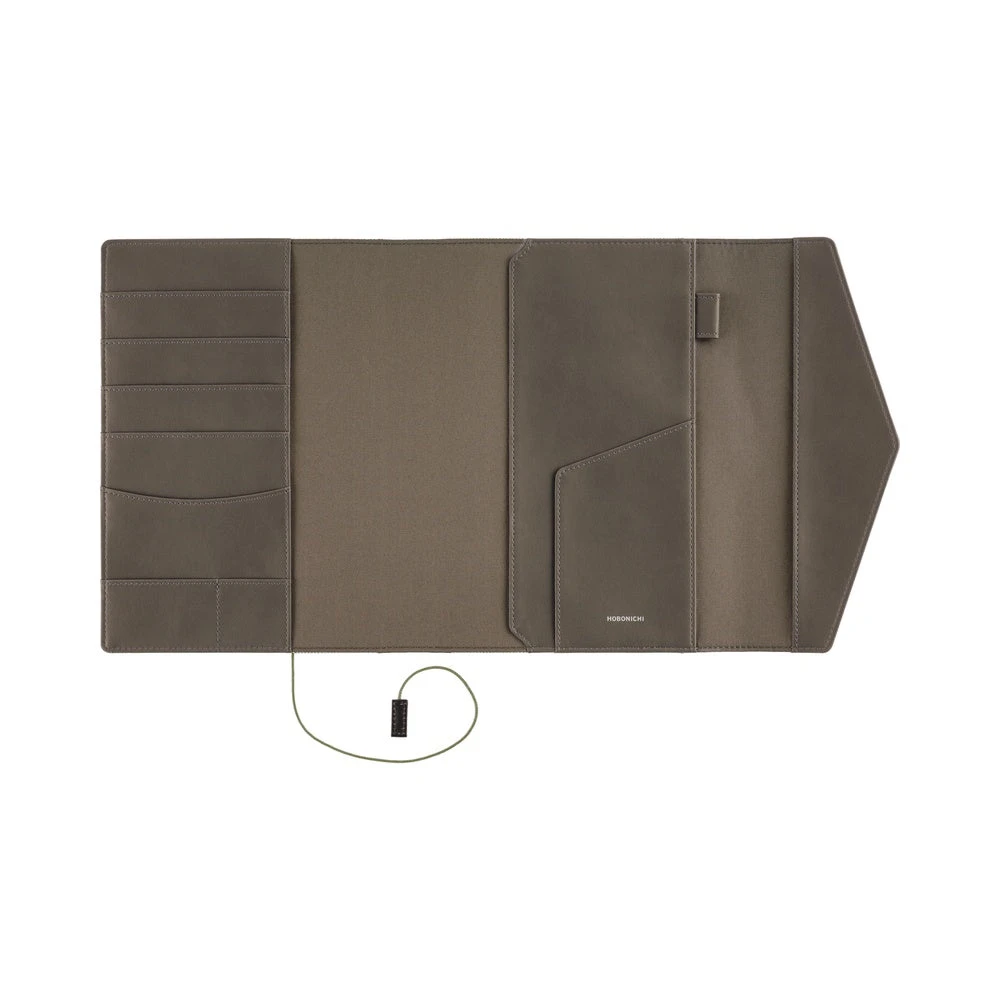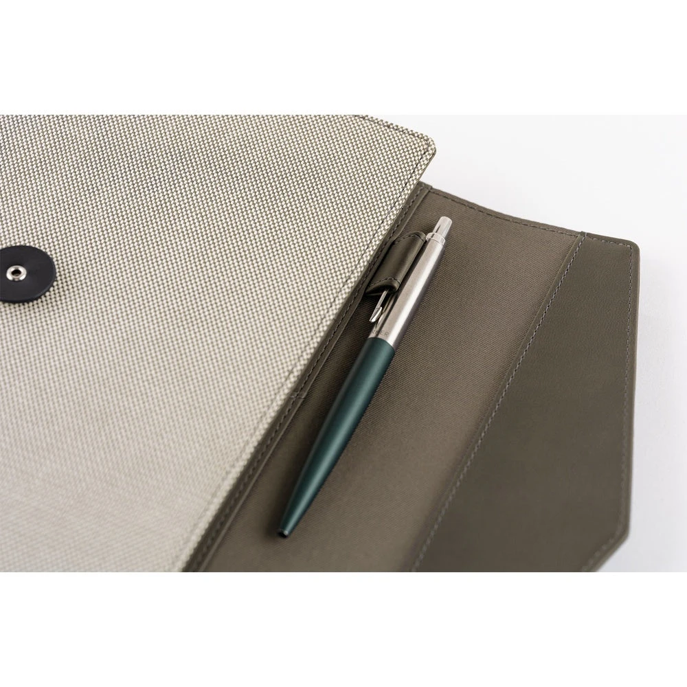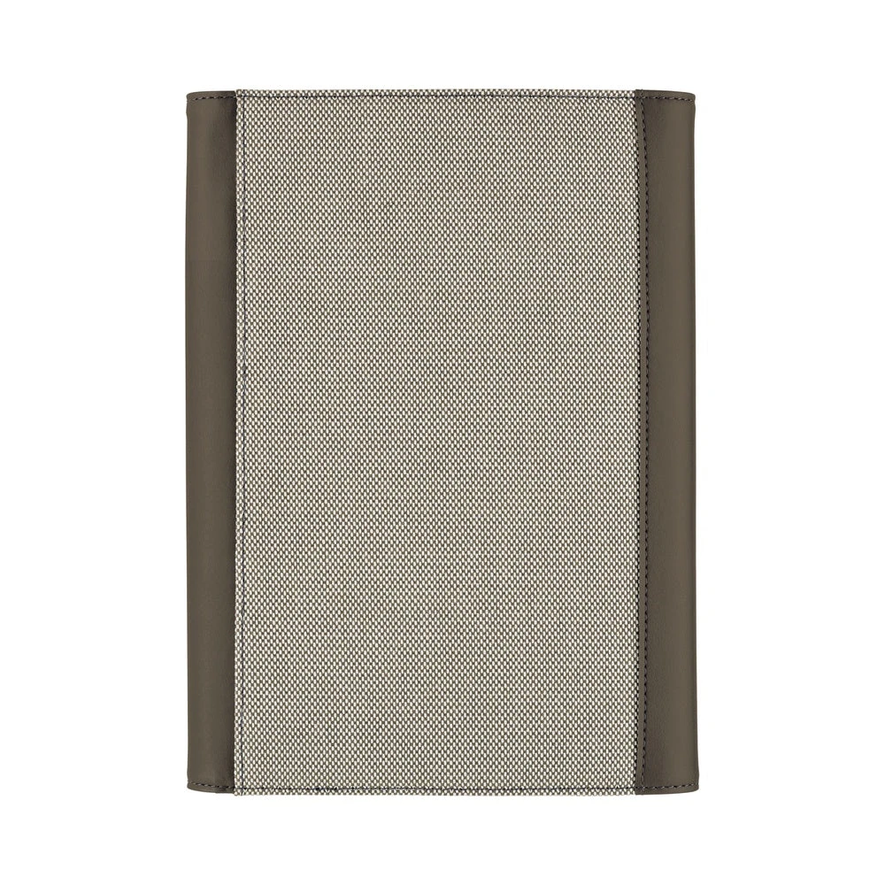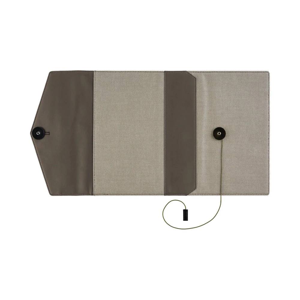 This cover stands out with its ball-button closure, triangular flap, and mix of two fabric textures. It’s designed to make your writing time feel special, like composing a letter. The string that wraps around the cover adds to its charm, turning the act of fastening and unfastening it into a small, enjoyable ritual. The tri-fold design stays securely closed with a button and includes an interior pen hook for storing a pen by its clip.