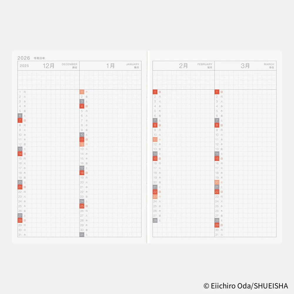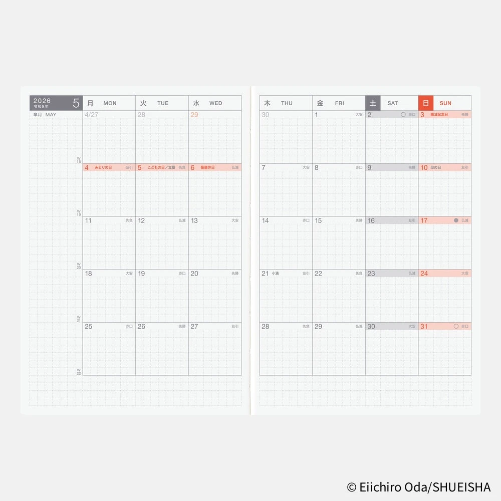 The bright red cover is a stark departure from that of the standard Hobonichi Techo Original. It’s designed to evoke the main character Luffy and includes the One Piece logo. The familiar aspects of the book include lay-flat binding, thin and light Tomoe River Paper that’s easy to write on, 3.7 mm graph paper for easy reading and writing, and 12 color tabs for easy differentiation across months. The book remains compact despite containing a yearly calendar, yearly index, monthly calendar (Monday-start), daily pages, and blank notebook pages.