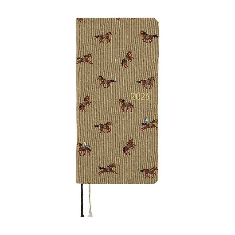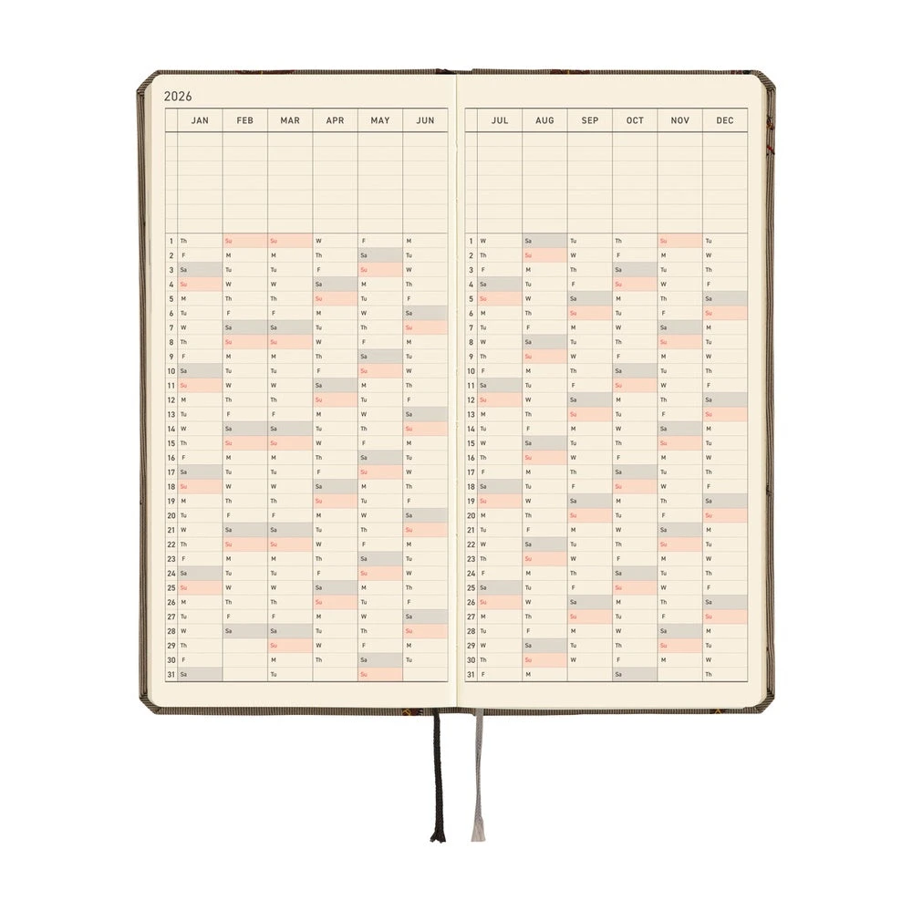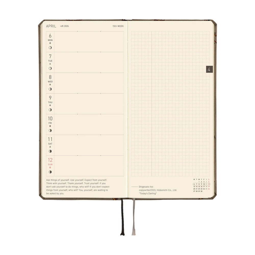 This Hobonichi Techo Weeks is a compact weekly-edition book that’s easy to carry everywhere. The book is slim and roughly the size of a long wallet, making it easy to fit into a bag or suit pocket. The main layout of the book consists of a weekly calendar on the left page and dashed graph paper on the right page. Each weekly spread also contains the characteristic Hobonichi quote in English on the bottom of the page. Although slim at first glance, the book holds 73 graph-ruled memo pages for note-taking at the end of the book. The Weeks is available with a variety of different cover designs on the book itself and does not require an additional cover purchased separately.