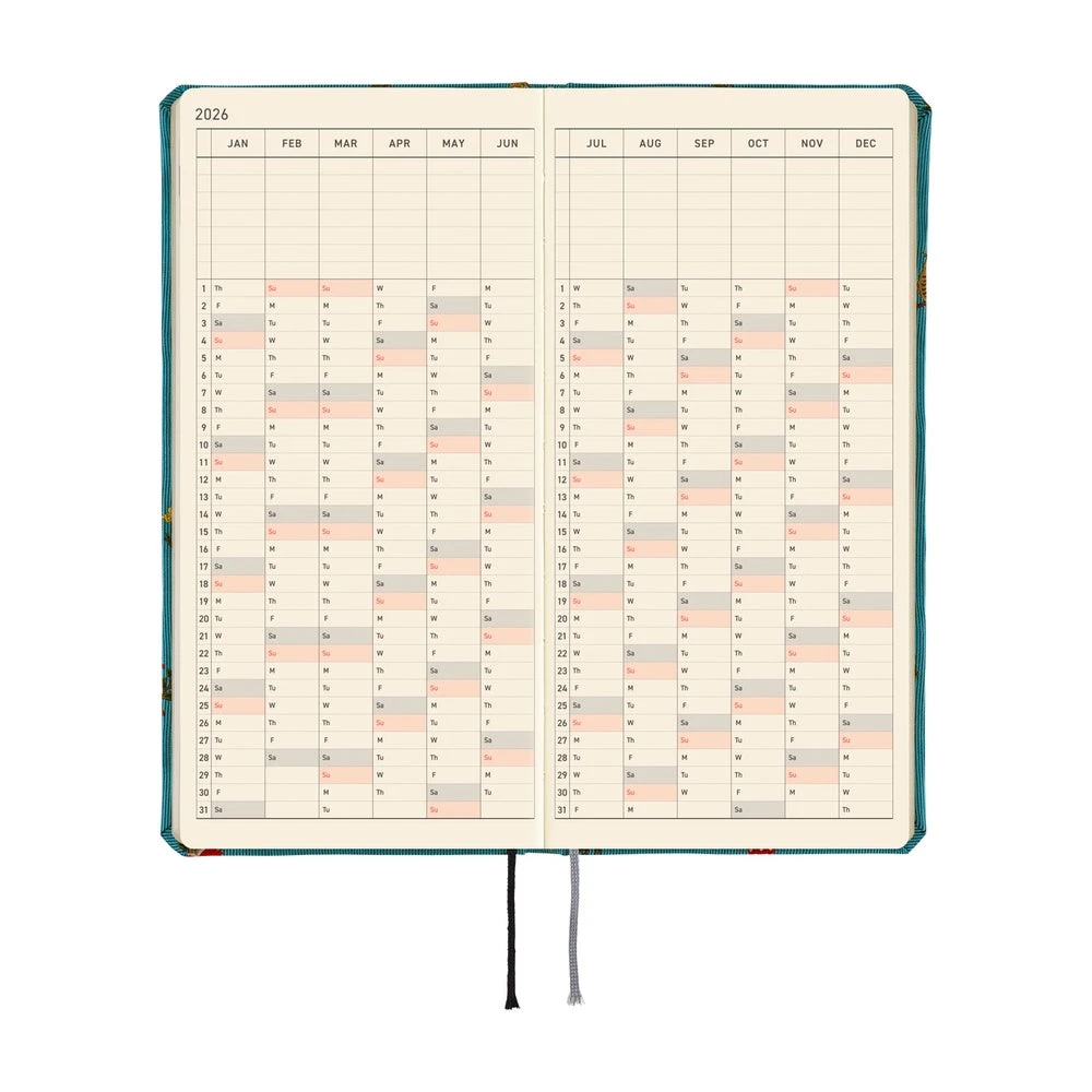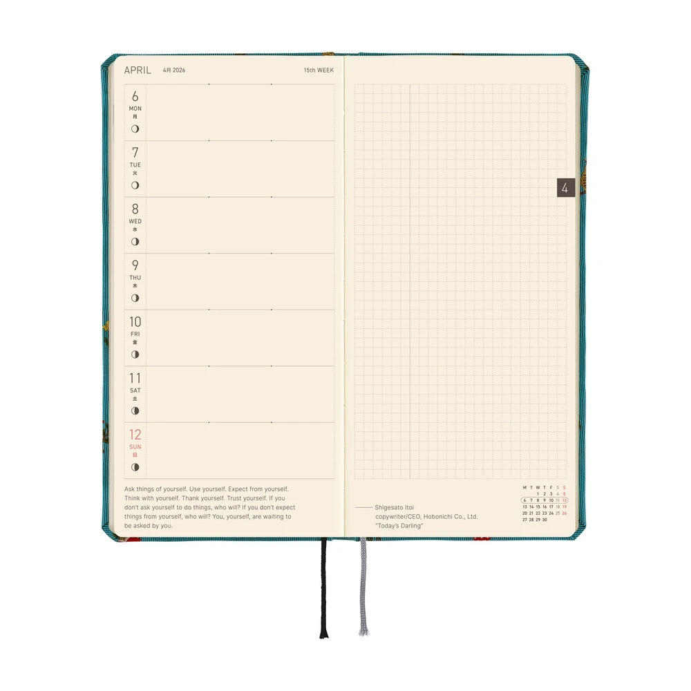 This Hobonichi Techo Weeks is a compact weekly-edition book that’s easy to carry everywhere. The book is slim and roughly the size of a long wallet, making it easy to fit into a bag or suit pocket. The main layout of the book consists of a weekly calendar on the left page and dashed graph paper on the right page. Each weekly spread also contains the characteristic Hobonichi quote in English on the bottom of the page. Although slim at first glance, the book holds 73 graph-ruled memo pages for note-taking at the end of the book. The Weeks is available with a variety of different cover designs on the book itself and does not require an additional cover purchased separately.