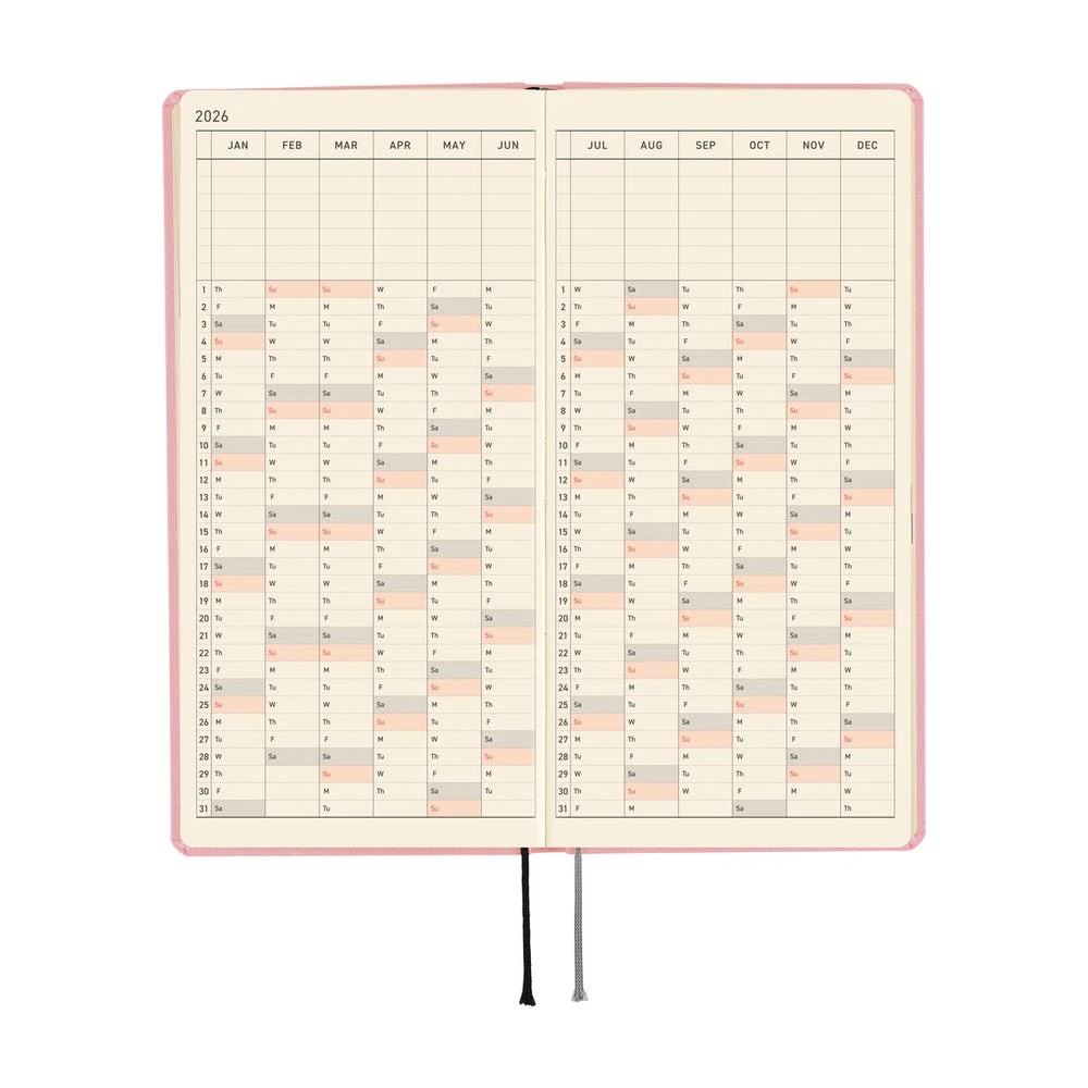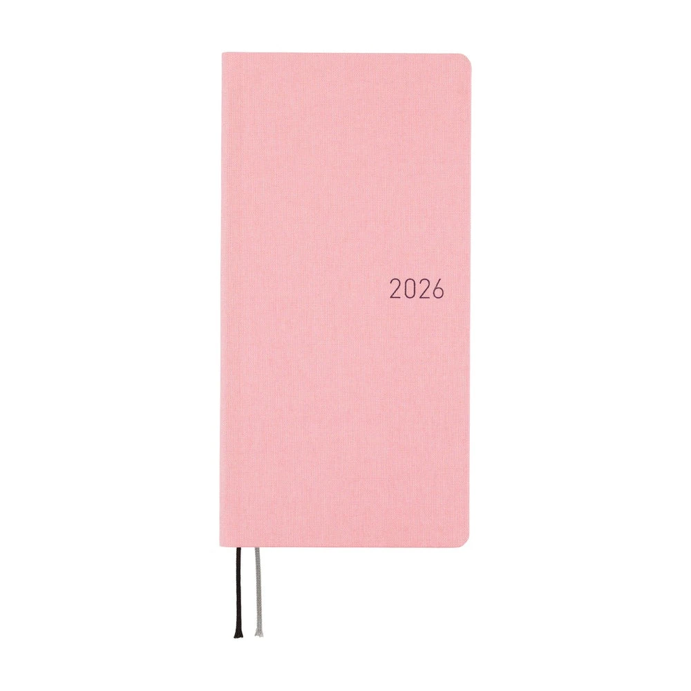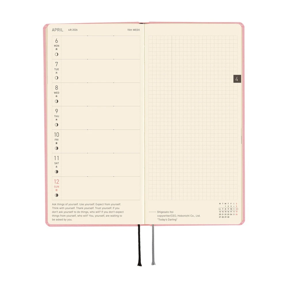 This Hobonichi Techo Weeks is a compact weekly-edition book that’s easy to carry everywhere. The book is slim and roughly the size of a long wallet, making it easy to fit into a bag or suit pocket. The main layout of the book consists of a weekly calendar on the left page and dashed graph paper on the right page. Each weekly spread also contains the characteristic Hobonichi quote in English on the bottom of the page. Although slim at first glance, the book holds 73 graph-ruled memo pages for note-taking at the end of the book. The Weeks is available with a variety of different cover designs on the book itself and does not require an additional cover purchased separately.