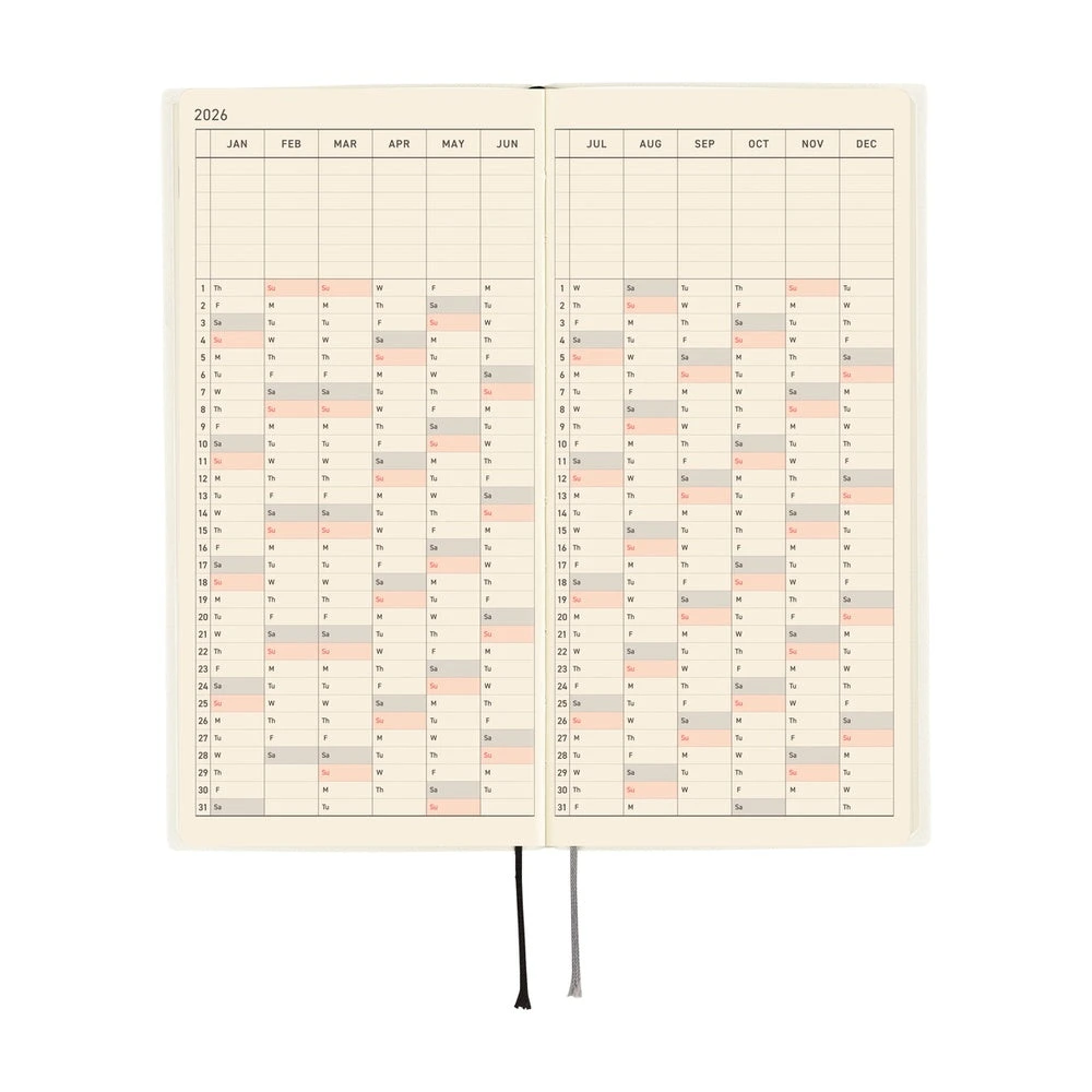 This Hobonichi Techo Weeks is a compact weekly-edition book that’s easy to carry everywhere. The book is slim and roughly the size of a long wallet, making it easy to fit into a bag or suit pocket. The main layout of the book consists of a weekly calendar on the left page and dashed graph paper on the right page. Each weekly spread also contains the characteristic Hobonichi quote in English on the bottom of the page. Although slim at first glance, the book holds 73 graph-ruled memo pages for note-taking at the end of the book. The Weeks is available with a variety of different cover designs on the book itself and does not require an additional cover purchased separately.