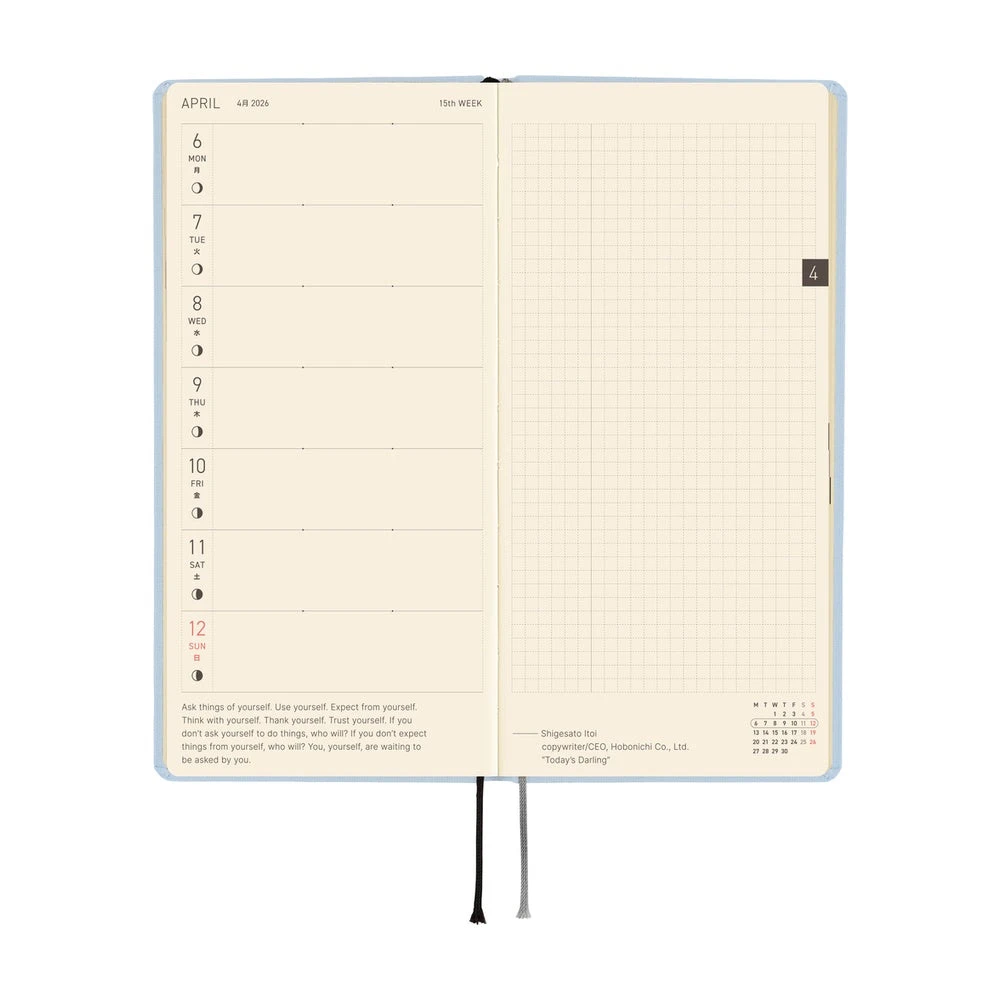 This weekly-edition Hobonichi Techo is a compact book that’s easy to carry everywhere. The book is slim and roughly the size of a long wallet, making it easy to fit into a bag or suit pocket. The main layout of the book consists of a weekly calendar on the left page and blank graph paper on the right page. Each weekly spread also contains the characteristic Hobonichi quote in Japanese on the bottom of the page.