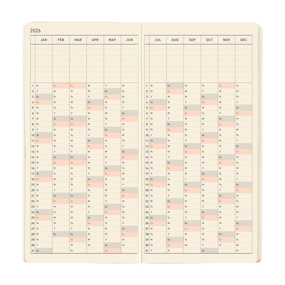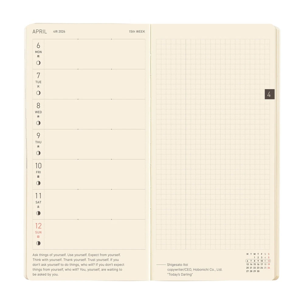 This weekly-edition Hobonichi Techo is a compact book that’s easy to carry everywhere. The book is slim and roughly the size of a long wallet, making it easy to fit into a bag or suit pocket. The main layout of the book consists of a weekly calendar on the left page and blank graph paper on the right page. Each weekly spread also contains the characteristic Hobonichi quote in Japanese on the bottom of the page.