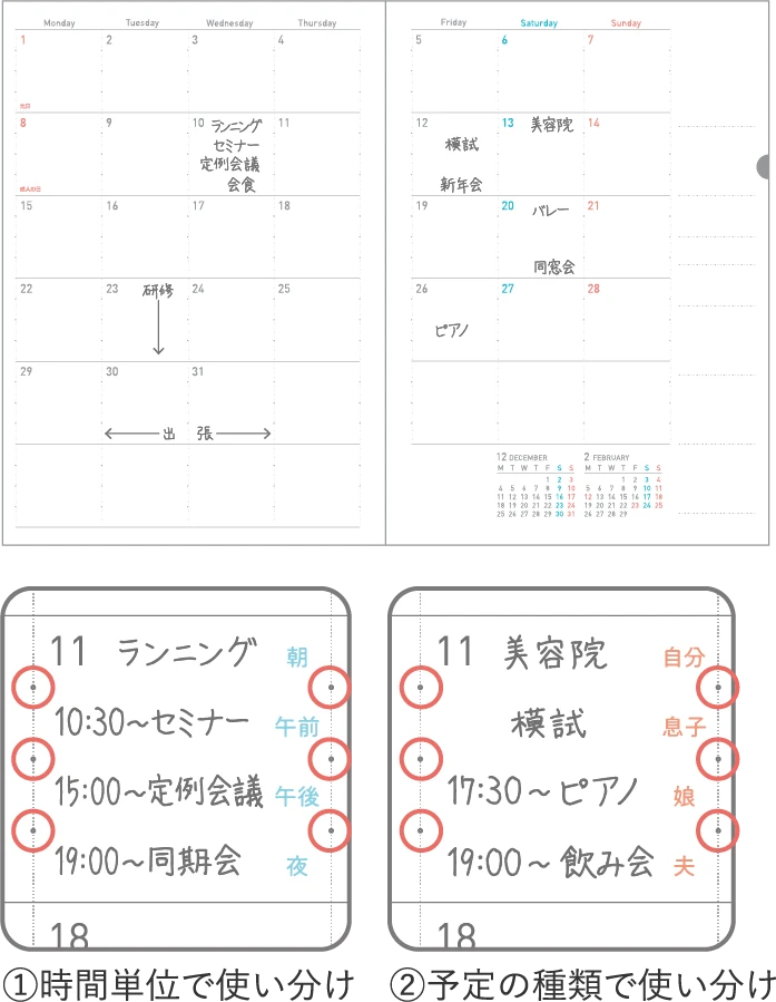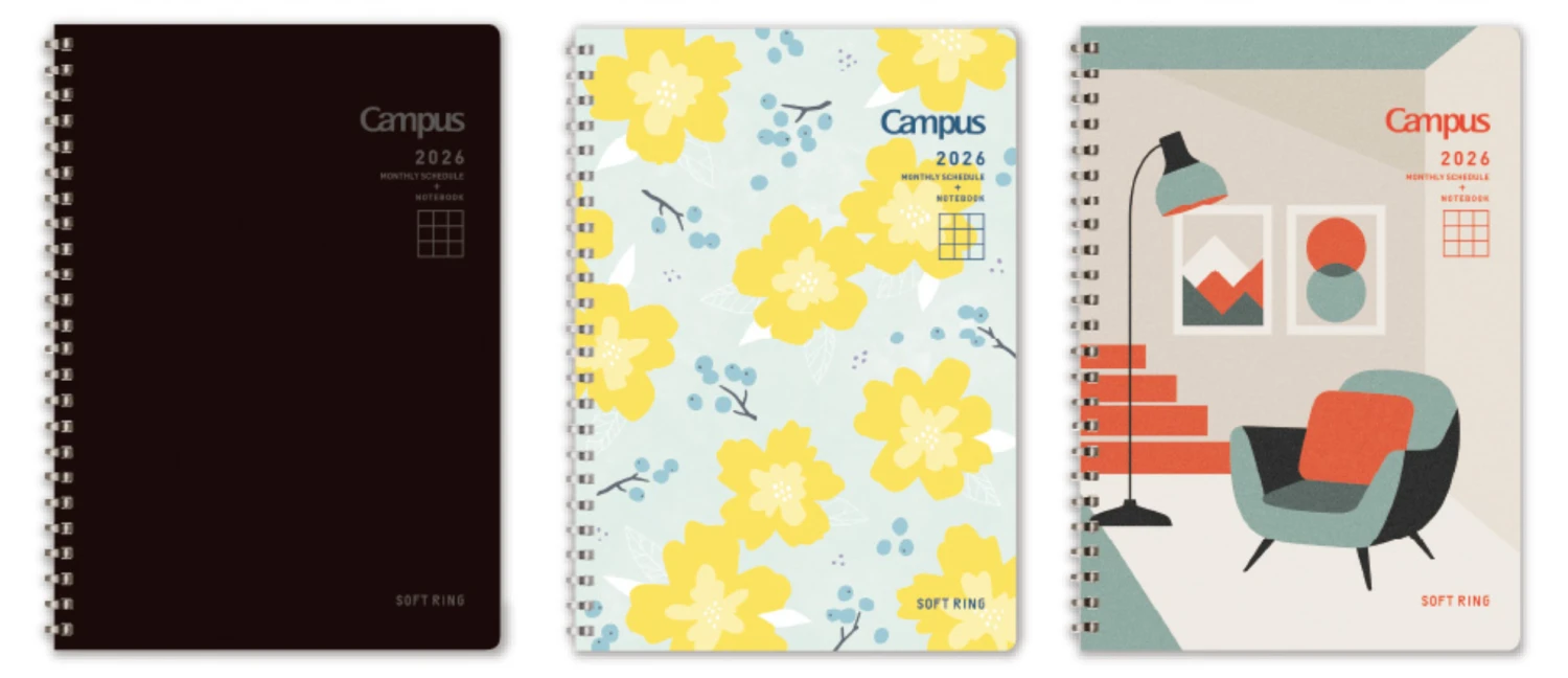A monthly diary from the Soft Ring Note series, featuring Kokuyo’s unique “Soft Rings” for easy writing and comfortable use even in tight spaces when folded flat.