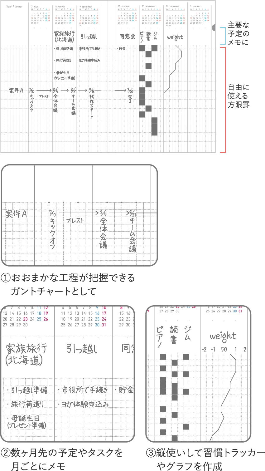 The note pages feature a high degree of freedom with grid lines, allowing for a writing experience similar to a regular notebook and making it easy to draw simple diagrams or illustrations. This diary includes a Year Planner page that allows for an overview of 7 months (approximately half a year) at a glance. This enables rough Gantt charts and future log-like usage, making it easier to grasp the flow and long-term planning of tasks.