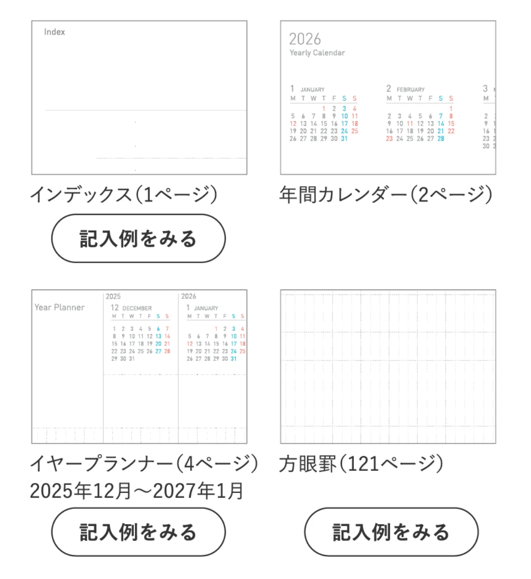 - Four-page annual planner covering December 2025 through January 2027