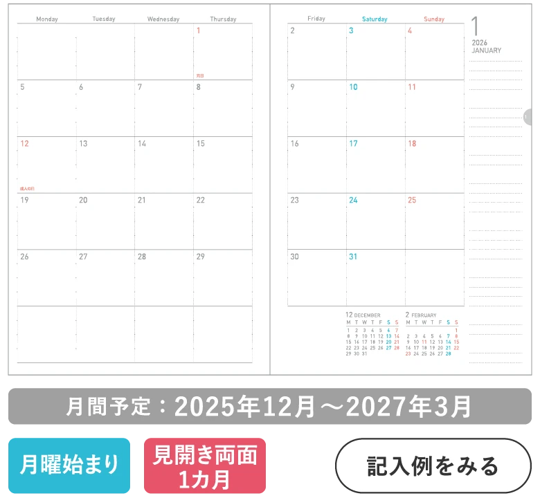 A monthly diary from the Soft Ring Note series, featuring Kokuyo’s unique “Soft Rings” for easy writing and comfortable use even in tight spaces when folded flat.