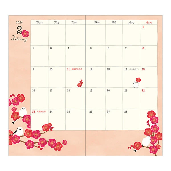 Midori’s Pocket Diary – Bird is a monthly planner with cute bird illustrations, printed on smooth MD Paper with a cloth-bound cover. The 2026 theme is “Healing Designs with Birds and Seasonal Plants,” featuring colorful birds and vibrant plants that bring a sense of healing and cheer to everyday life. It includes useful features like monthly index tabs, a ribbon bookmark, and a sturdy PVC cover with a pen loop.