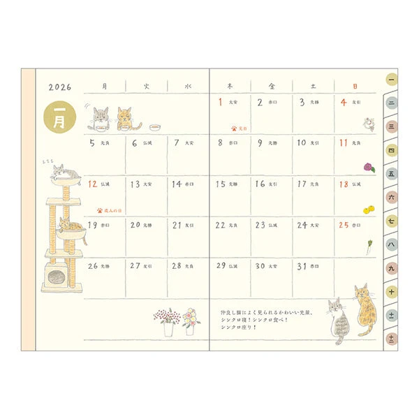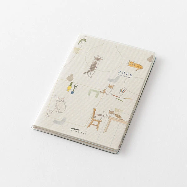 Midori’s Pocket Diary – Cat is a monthly planner featuring charming cat illustrations and columns by Sayo Koizumi. The 2026 theme, “The Cats of the Koizumi Household,” follows the everyday lives of the family’s four unique cats, with a special column at the end titled “A kitten has come to our house!”. Thoughtfully designed with MD Paper, cloth binding, monthly index tabs, a ribbon bookmark, and a pen loop on the PVC cover, it’s both adorable and practical for everyday planning.
