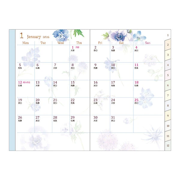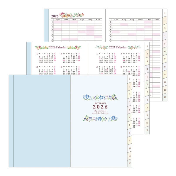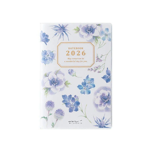 Midori’s Pocket Diary – Country Time Flowers is a monthly planner featuring beautiful floral illustrations by Takako Kuriowa, printed on smooth MD Paper with a cloth-bound cover. The “Country Time” series is based on the theme of seasonal flowers, and the 2026 edition is inspired by the “Something Blue Wedding Bouquet,” featuring popular blue flowers often seen in gardens. Practical details like monthly index tabs, a ribbon bookmark, and a sturdy PVC cover with a pen loop make it both charming and functional.