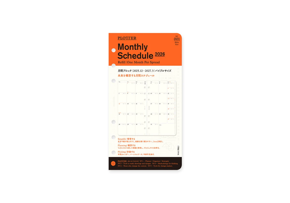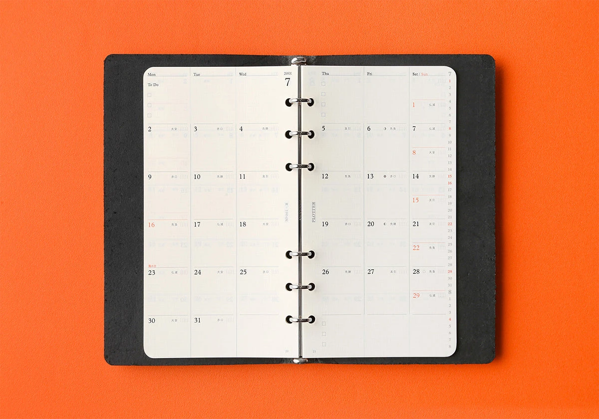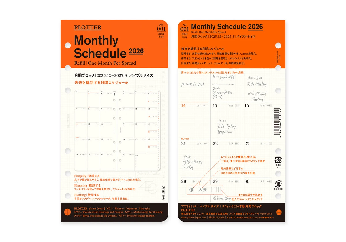 The dated Monthly Schedule Refill is meticulously designed to maximize the use of limited space and to provide a dated planner functionality to your PLOTTER Leather Binder Bible Size. It includes a monthly schedule at a glance, while the margin provides space to note down tasks or to-do lists.