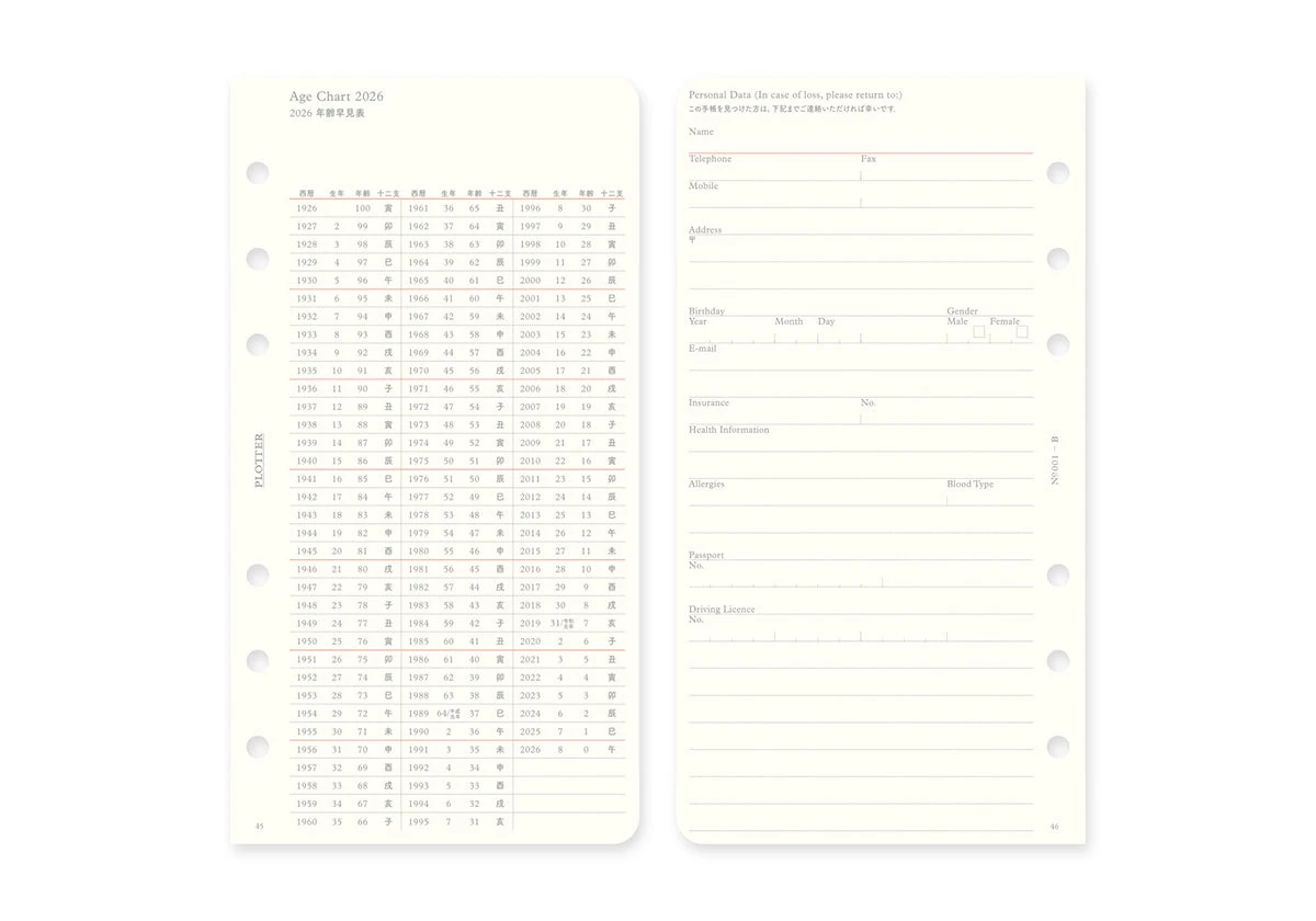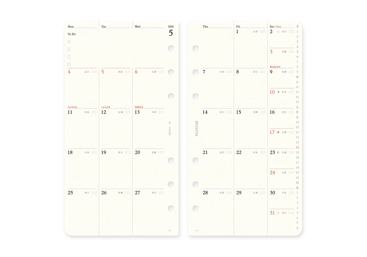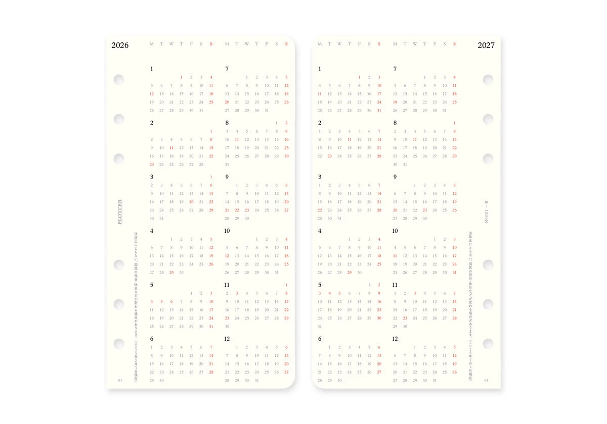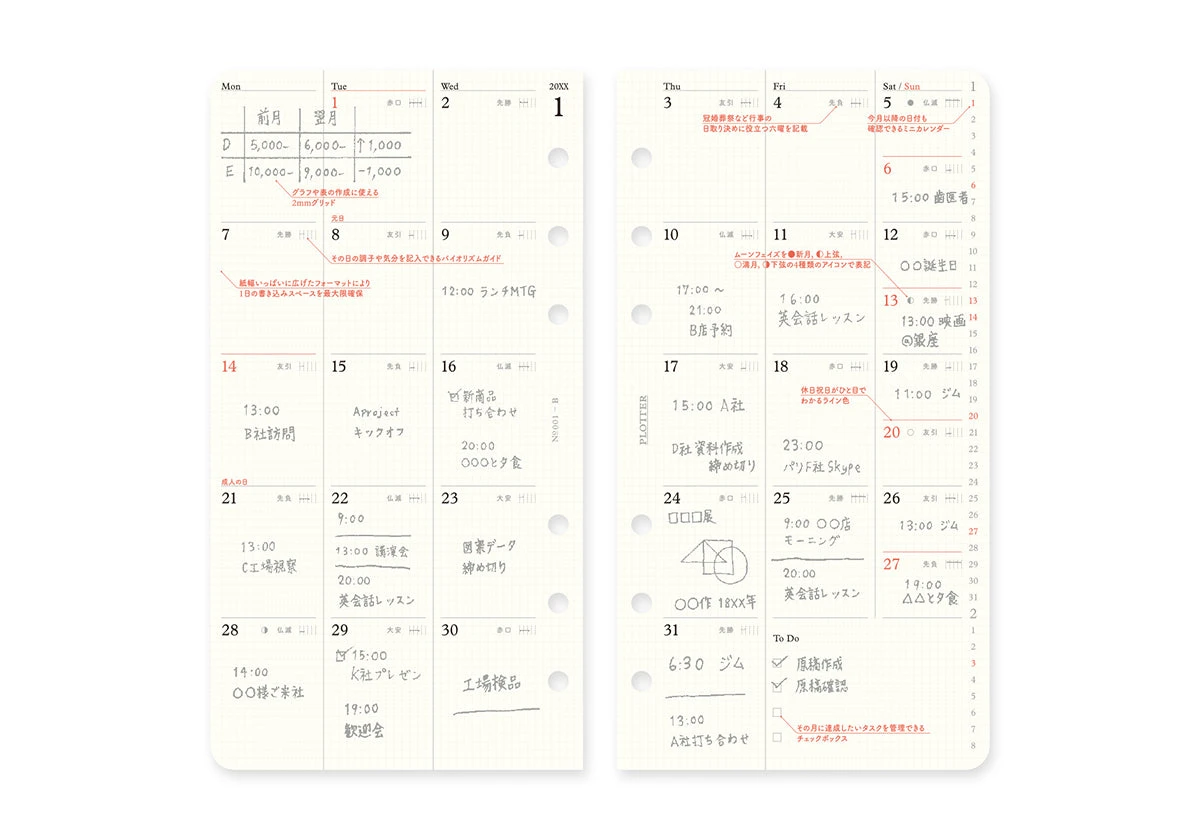 The dated Monthly Schedule Refill is meticulously designed to maximize the use of limited space and to provide a dated planner functionality to your PLOTTER Leather Binder Bible Size. It includes a monthly schedule at a glance, while the margin provides space to note down tasks or to-do lists.