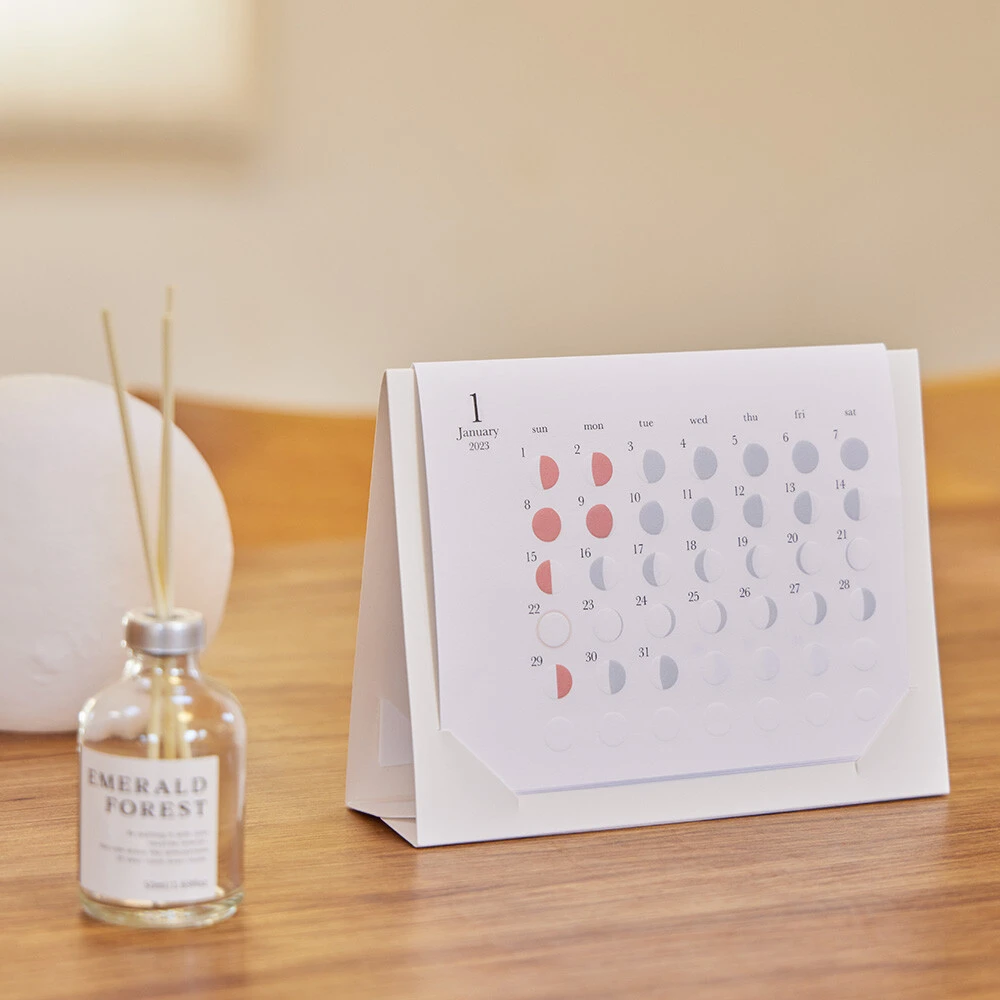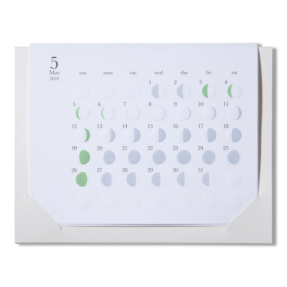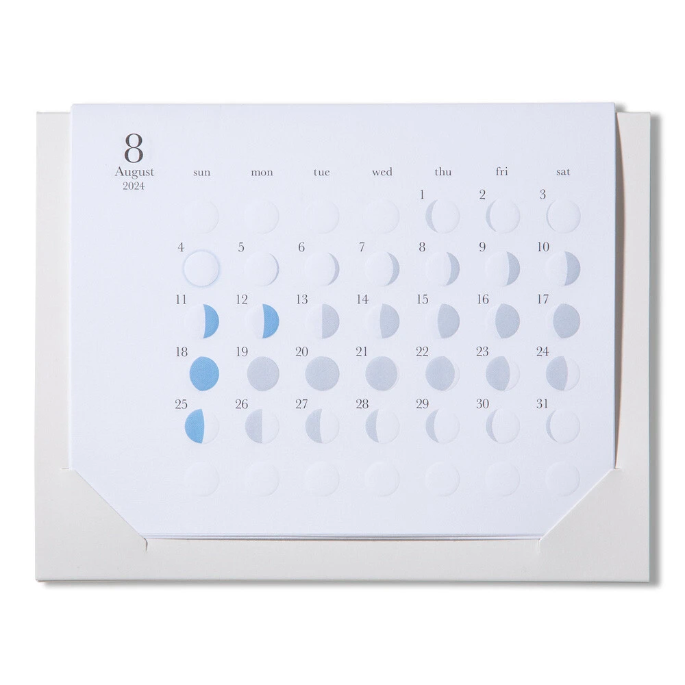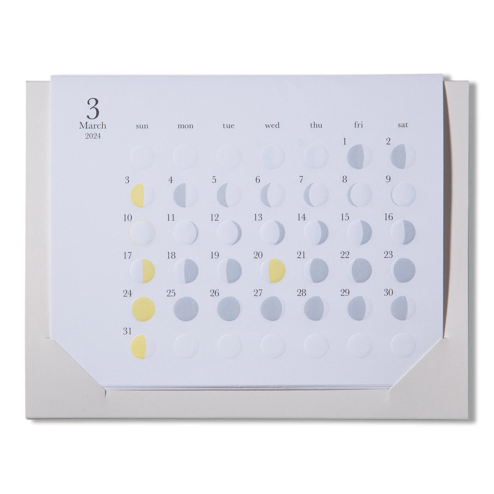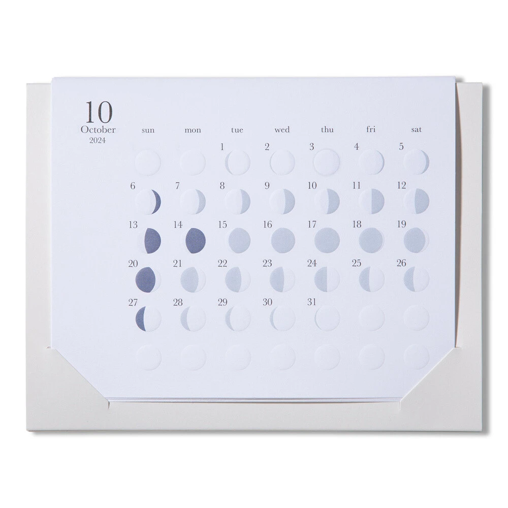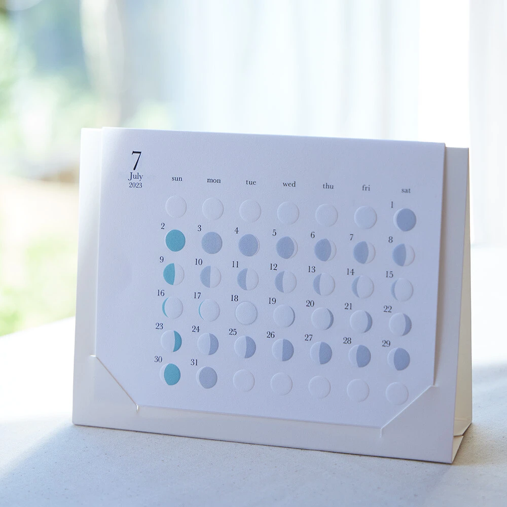 Replug moon calendar “Michiru” shows you phases of the moon. It represents the silhouette of the moon by embossing with soft-feeling paper. Seasonal colors with beautiful color patterns provide a fresh feel each month with each turn of a page. No plastic or metal rings are used in this calendar, and everything is made of paper. It has a simple structure that allows you to check two months of the calendar by turning it over.