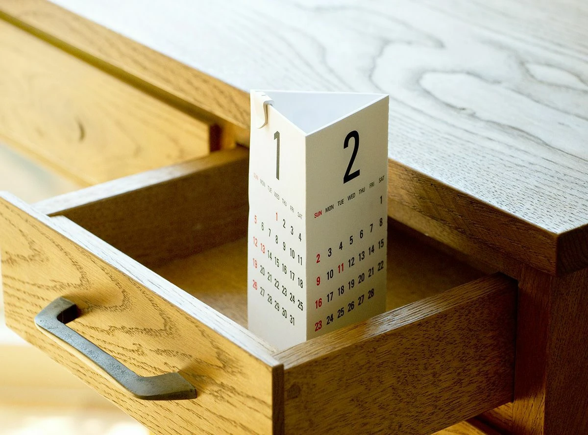Replug Triangular Desk Calendar is a small desk calendar that allows you to overview yearly calendar three months at a time. The calendar is compact and small. It comes with paper clip to stabilize in its triangular design, and it could be used flexibly to unroll and overview full year at a time.